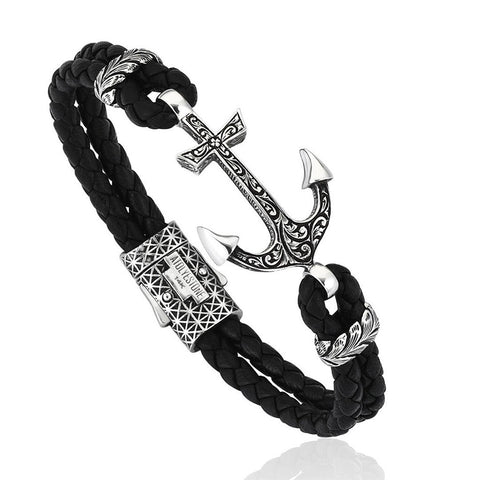 Classic Anchor Leather Bracelet - Solid Silver